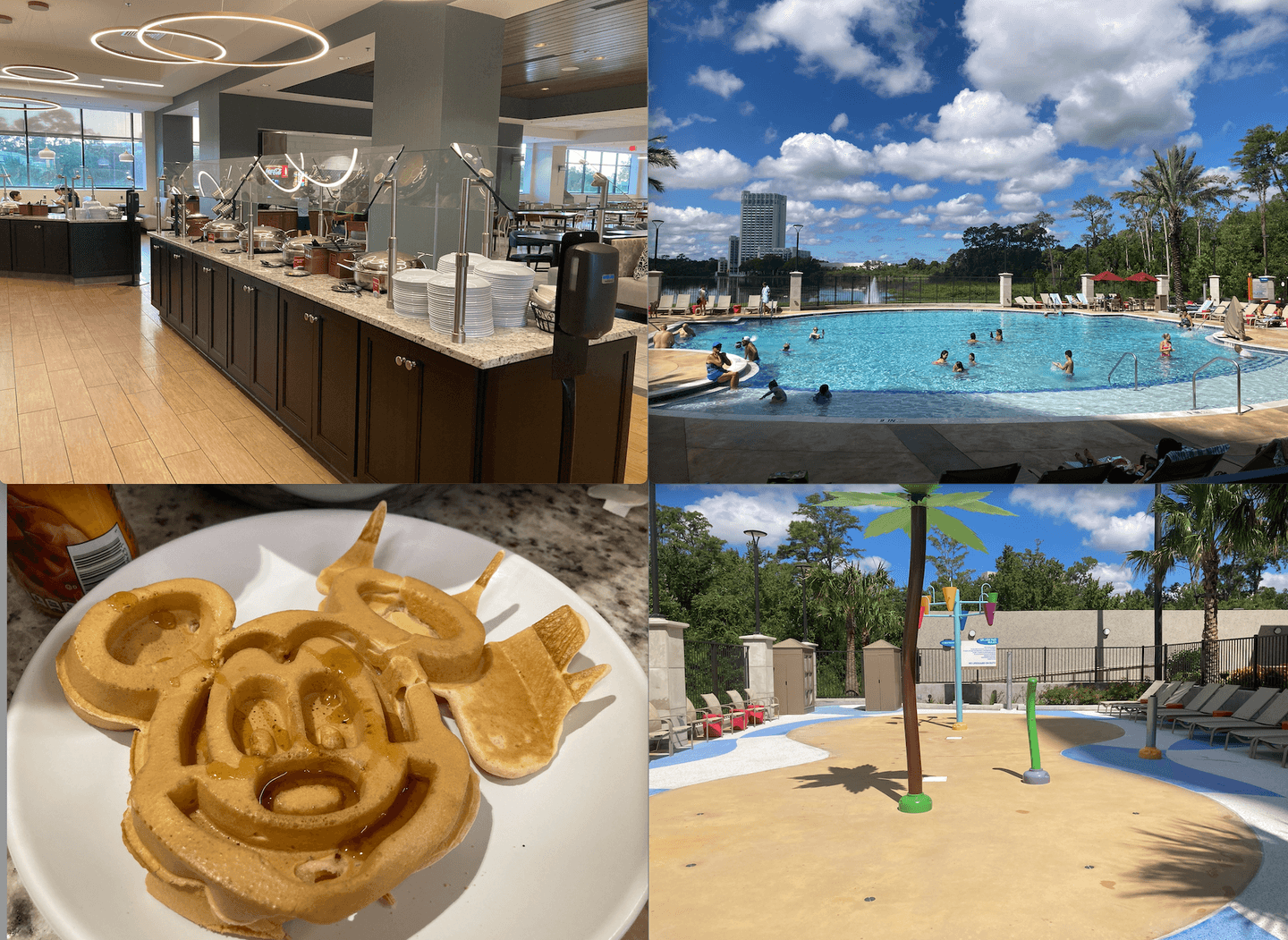 Amenities at Drury Plaza Hotel Orlando include (counterclockwise from top left): free hot breakfast, a DIY Mickey Mouse waffle bar, a splash pad for kids and a pool. (Photos by Sally French)