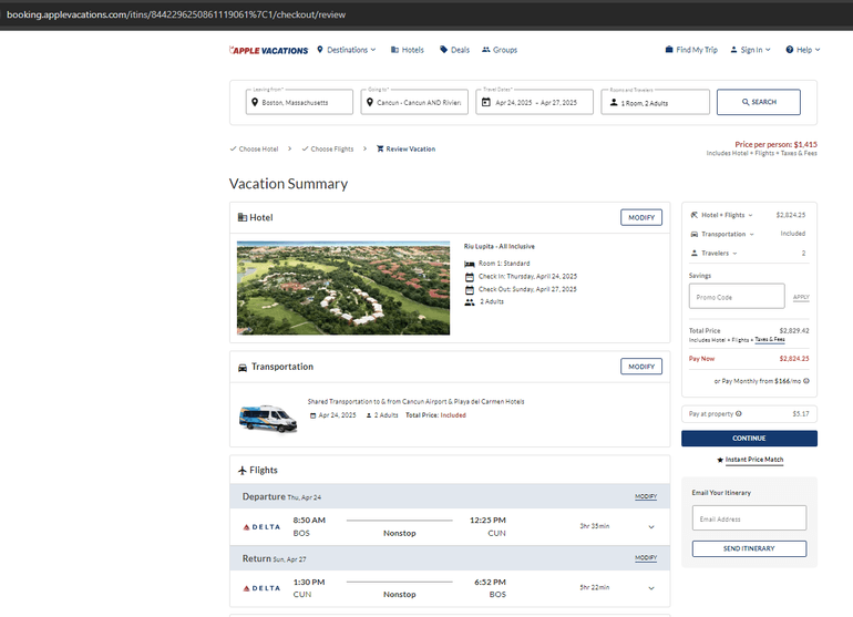 For April 24-27, 2025, an all-inclusive trip from Boston to the Riu Lupita in Playa del Carmen, Mexico, for two people in a room is $1,415 per person, including hotel, flights, taxes and fees. The total is $2,830.