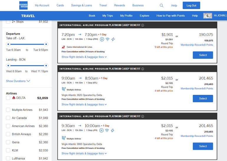 Cardholders can book flights on one of dozens of international airlines via the AmEx Travel portal; though the discount varies based on the airline, route and date, the savings can range from hundreds to thousands of dollars.