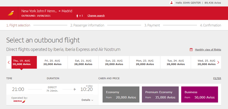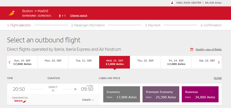 For example, you can book an award flight during the peak summer season from New York-JFK to Madrid. Iberia's eonomy class (also called Blue) will run you as little as 20,000 Avios each way, whereas the airline's premium economy class will cost you 35,000 Avios one-way.