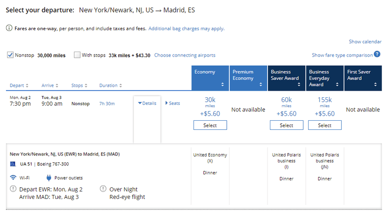 For example, you can fly from Newark to Madrid in United's business class (also called Polaris) for just 45,000 miles one way.