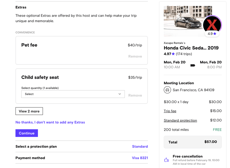 Depending on the level of add-on insurance from Turo selected, prices in the U.S. start as low as $10 per rental day. It’s pretty easy to compare and add plans at checkout.