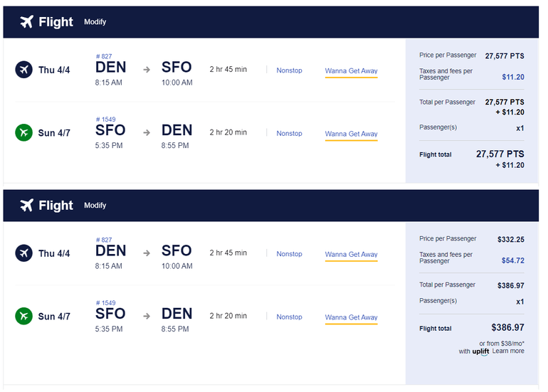 For example, instead of booking with United, you could transfer points to Southwest Airlines and book a comparable (though not identical) itinerary for 27,577 points and $11.20 in fees, versus a cash price of $386.97.
