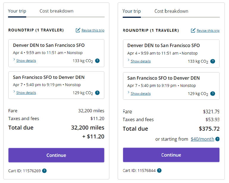 Suppose you’re booking a long weekend trip from Denver to San Francisco in the spring. You’ll be attending a wedding at the Hyatt Regency San Francisco and plan to pay out of pocket for your room there, but you have 60,000 United Airlines MileagePlus miles you can use to book your flight.