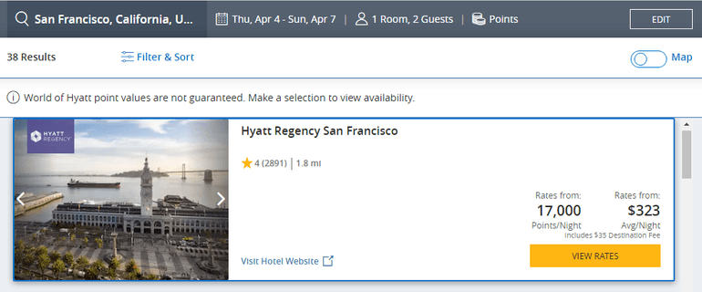 Alternatively, you could transfer points to Hyatt to book your stay at the Hyatt Regency San Francisco. The award cost is 17,000 points per night, totaling 51,000 points for your three-night visit.