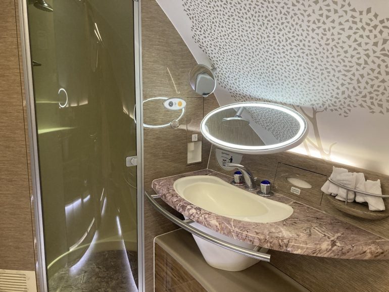 The in-flight shower for passengers in Emirates first class. (Photo by Sally French/NerdWallet)